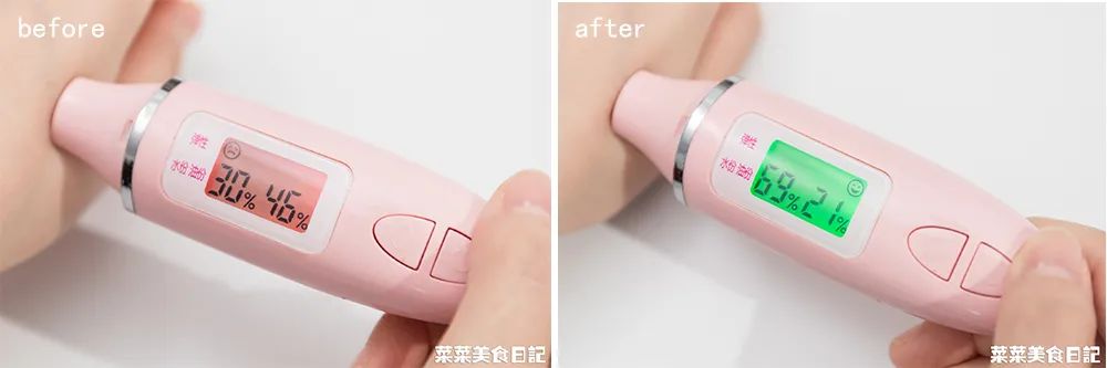 办公室实测,滋润度实在太棒了,测前30%,抹上后水分瞬间飙升至69%。