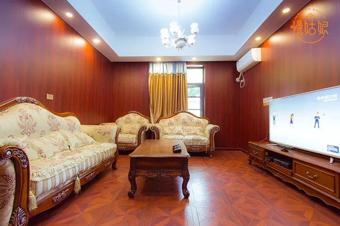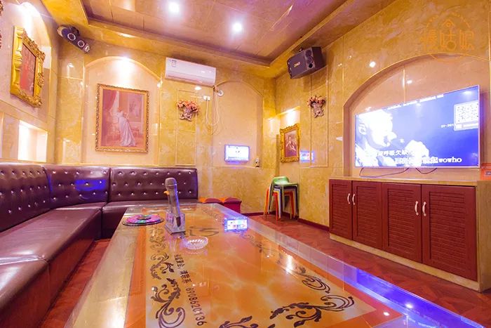 配置:云端点歌系统*1+无线话筒*2+茶几*1+挂机空调*1+皮质长条沙发+舞台灯光效果+音响*2