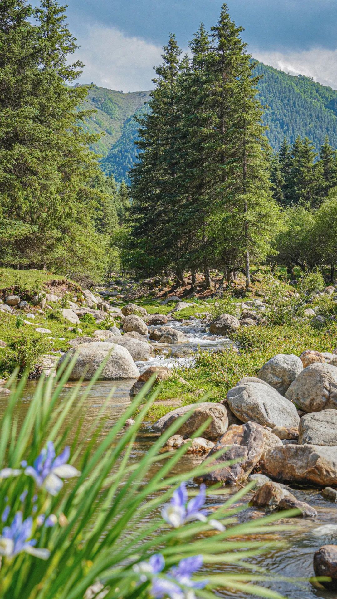 午餐后,又是两个半小时的车程,到了冰沟河景区。办理入住手续后,于4点40分正式进入景区。穿越一大片树林,便是马兰花草原,即便是花期的尾声,依然非常靓丽。