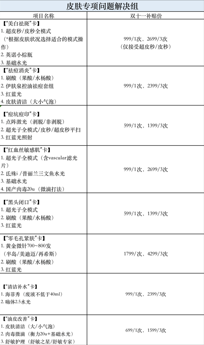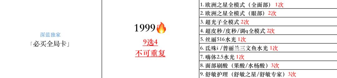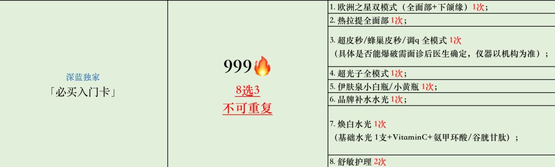 【吸油卡】全选 1. 深层清洁 1次 2. 肉毒微滴(衡力20u+基础水光)1次 3. 舒敏护理(舒敏之星/舒敏专家)1次 | 599 |