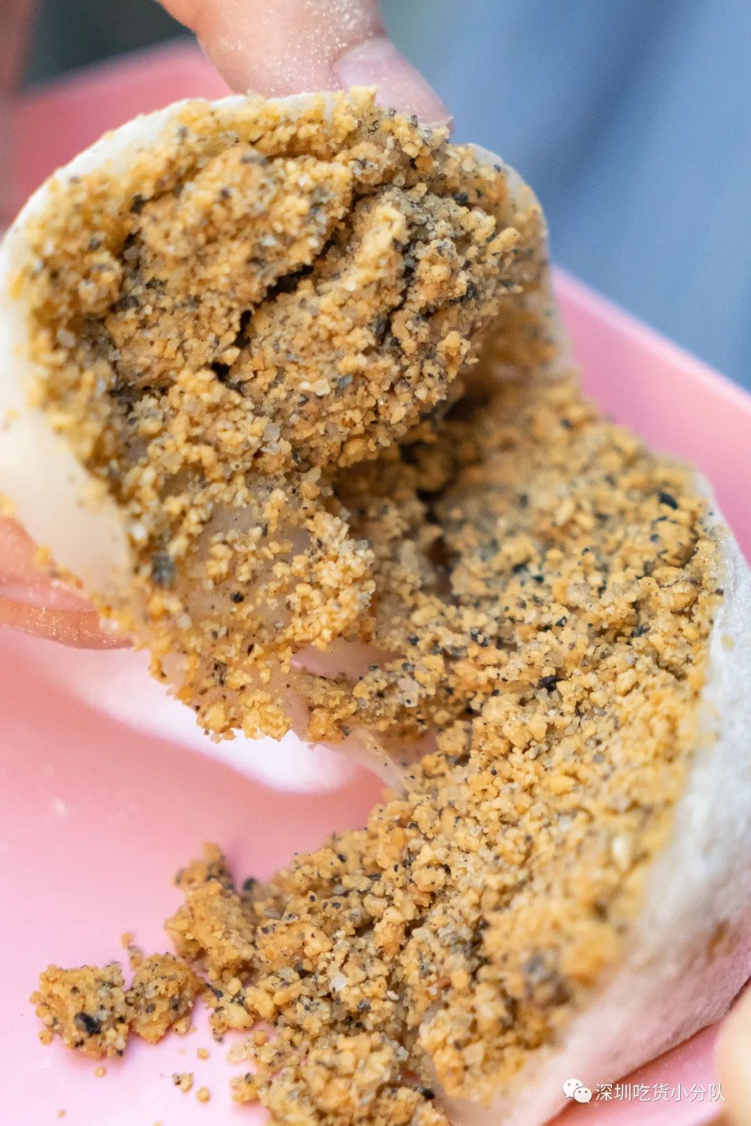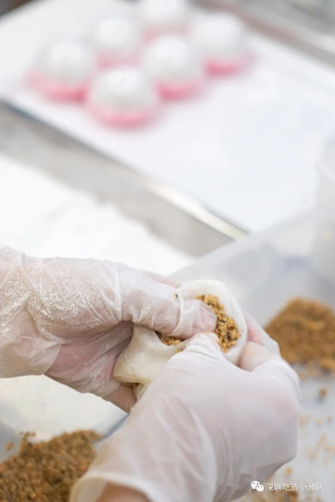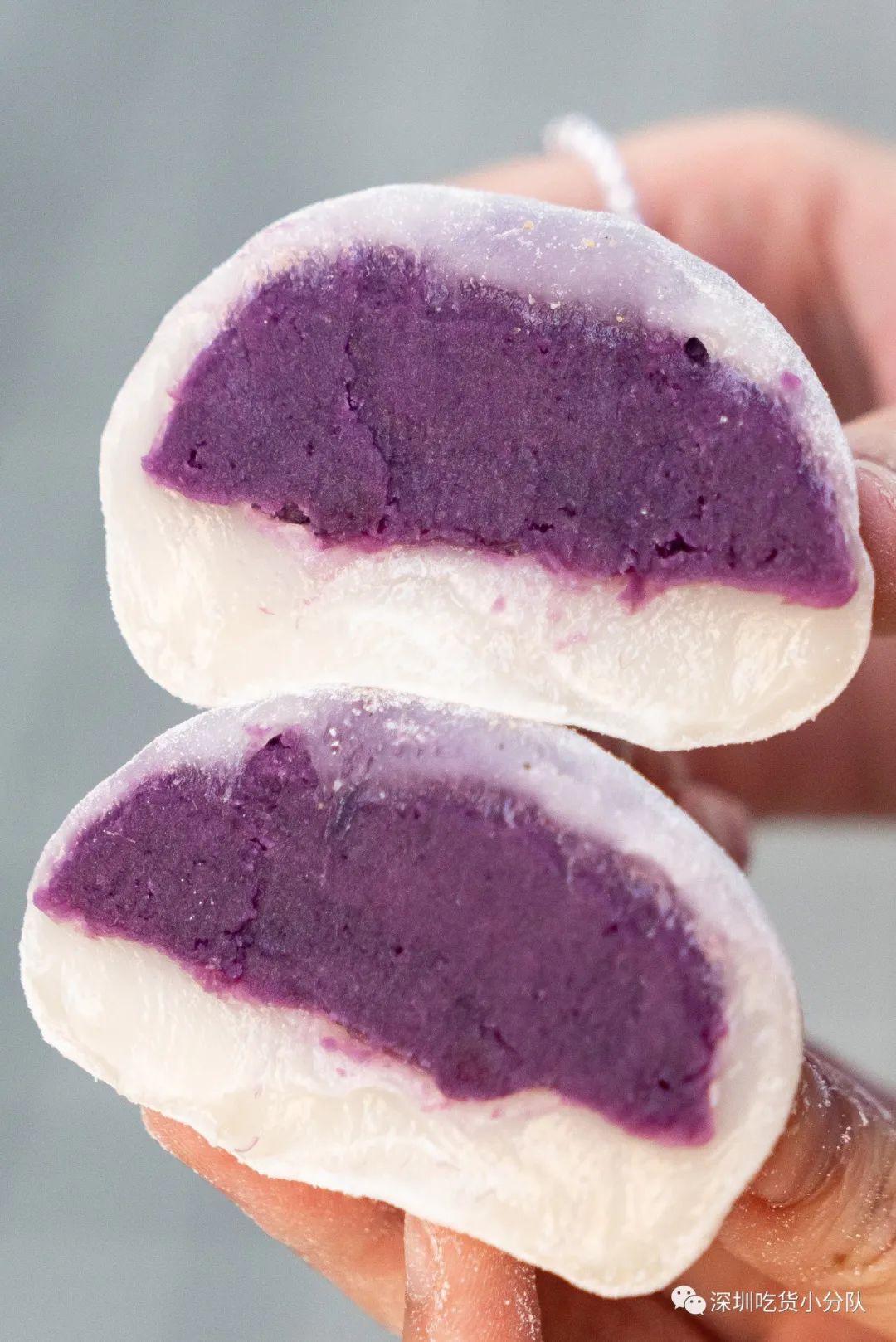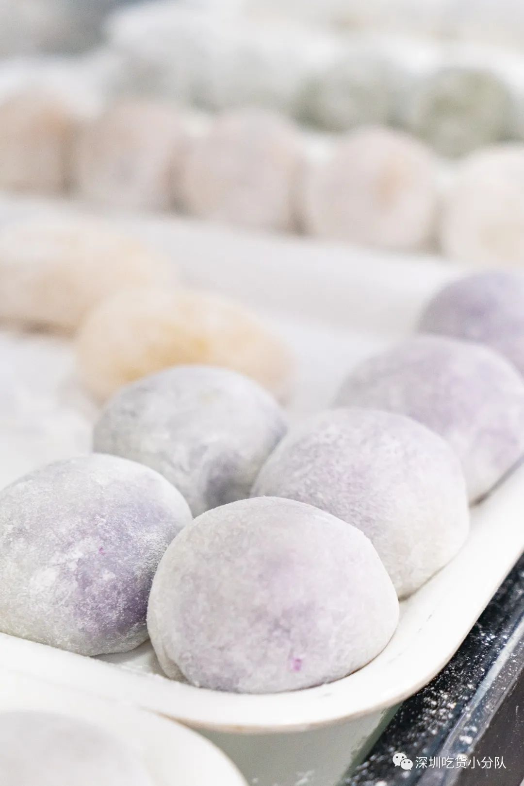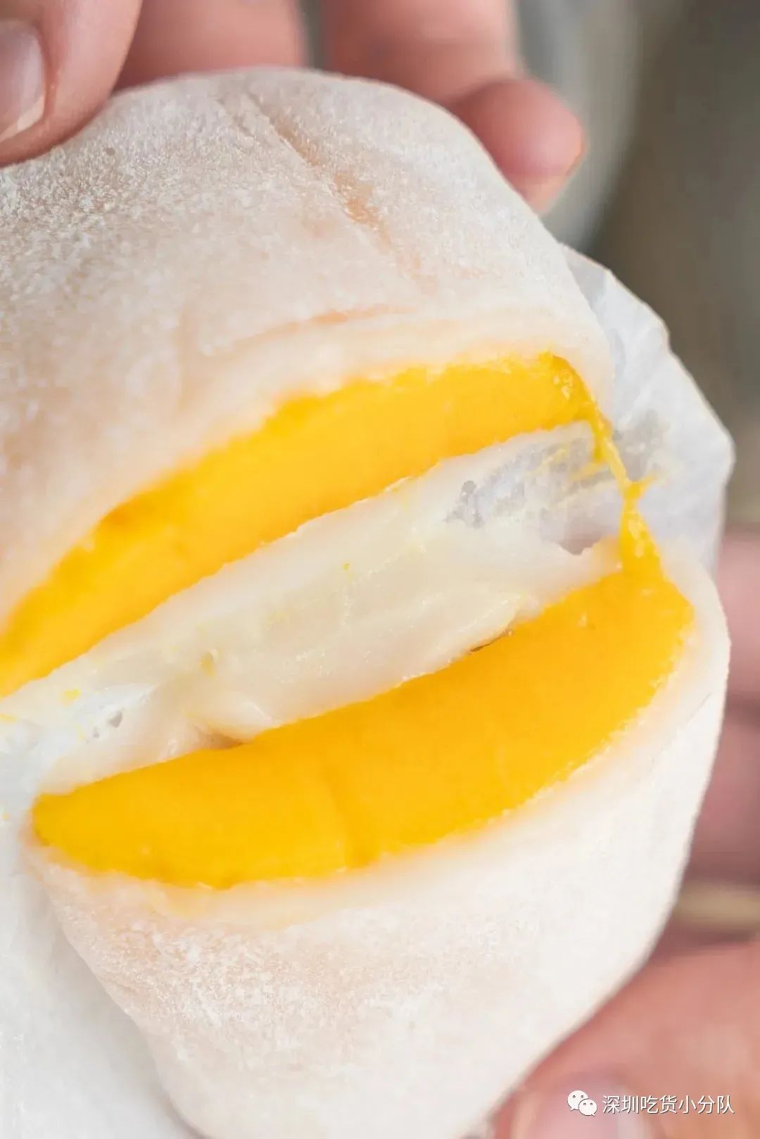 芒果糯米糍基本是每个人来店必点的一款,10元/颗。每颗都包了半颗手掌大的芒果,芒果甜度不定,酸酸甜甜吃完也不会太腻味。还有肉松、榴莲、紫薯等不同味道的可以选。