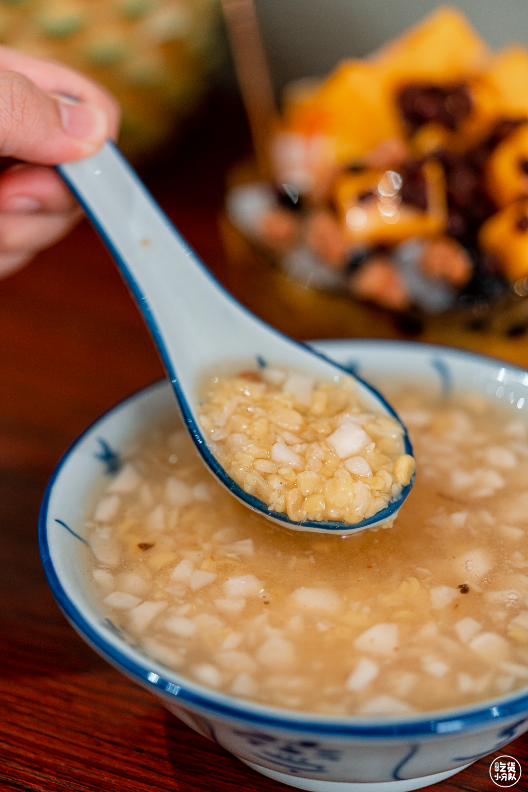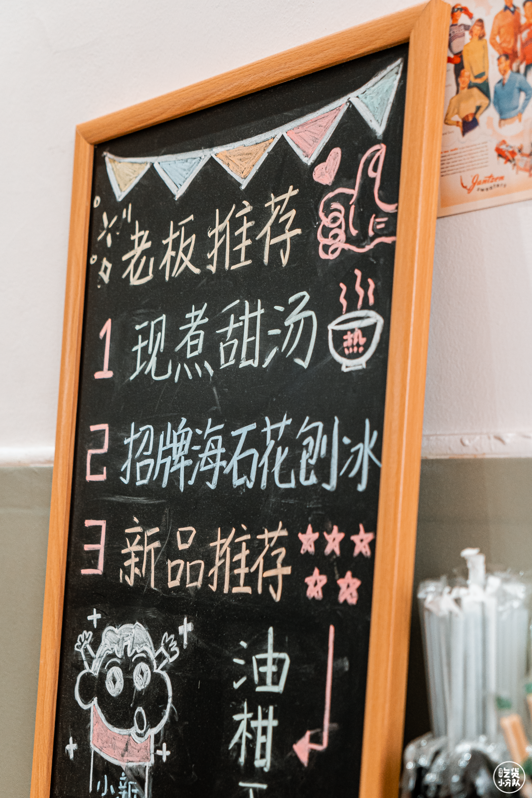 囍记甜冰,藏在巷子里,稍不注意就容易错过,老板娘是个热情的汕尾人。他们家的海石花刨冰是招牌推荐,上面堆满了各种小料。除了刨冰,老板娘还给我们推荐了甜汤,“都是我们那边的特色甜点,可以试试。”