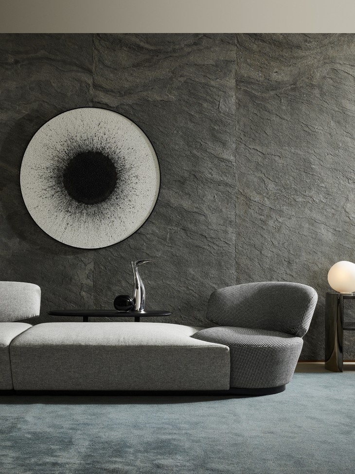 Circline弧形沙发全新高级灰色系,弧线元素的勾勒与灰白的色调展现深邃且静谧,打造极致优雅的视觉体验。不同明度的中性灰搭配,在空间中与温暖的黄色光韵交相辉映,光影柔和地流动。而明艳蓝绿色,如盈满晨曦的森林,亦如由飘渺的海藻,突显冷暖边缘的交互色泽。线条与温柔圆润交织互相衬托,茶几与角几之间高低错落的搭配,流露出高级的慵懒和惬意。