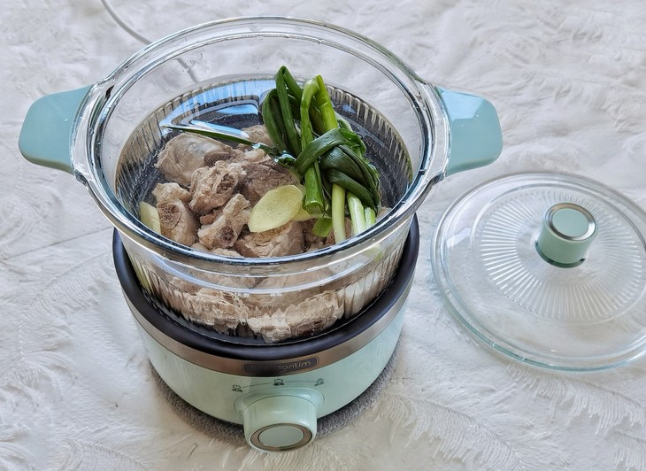 6. 洗干净的排骨放入东菱养生锅中,加入热水至快煮最高水位线处,放入3片生姜和葱结。