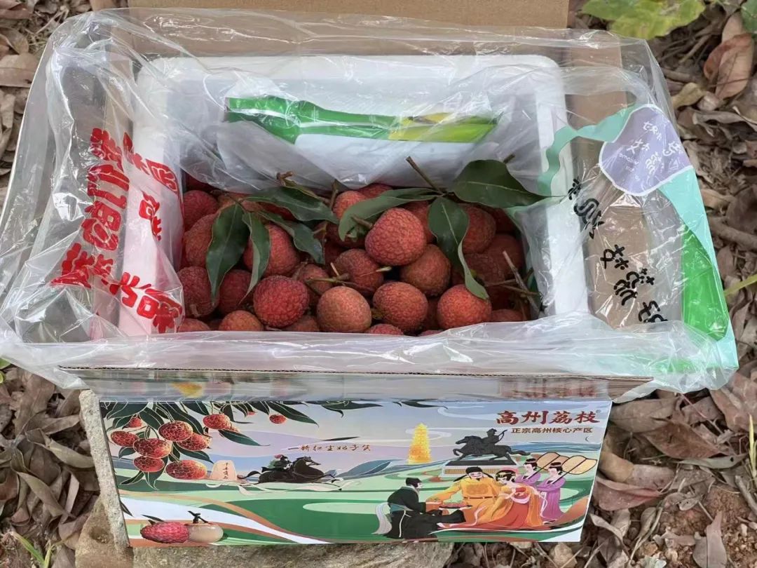 精心挑选后的果子,会被装到纳米恒温保鲜袋里,盖上吸水纸,再装进铝箔袋中,然后加入冰袋放入泡沫箱中,外面再套一层纸箱,被严密包裹的荔枝,乘着当天顺丰空运的航班,飞向你的餐桌。