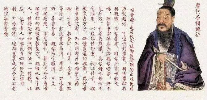 母亲喜欢吃梨,略懂医道的魏征,打算用梨汁和各种中药熬汤,结果熬着熬着不小心睡着了,醒来时水已经熬干,变成了膏糖。