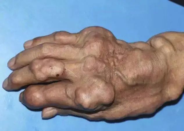 皮下痛风石外观为皮下隆起的大小不一的黄白色赘生物,皮肤表面菲薄,破溃后排出白色粉状或糊状物,经久不愈。临床表现为持续关节肿痛、压痛、畸形及功能障碍。
