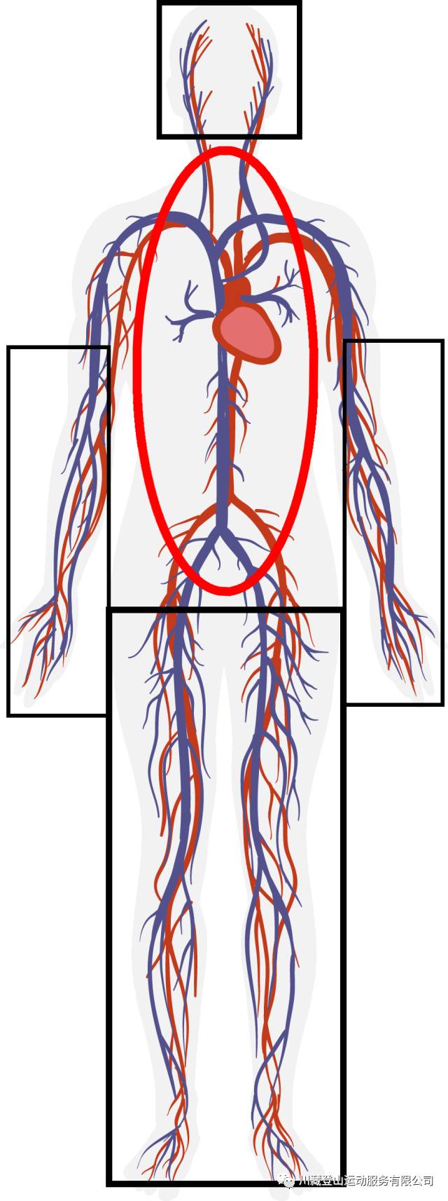 右图中的红色圆圈就是人体的核心体温区,脏器和消化系统从日常摄入的食物中转化出的热量通过心脏和血液将热量输送到全身。