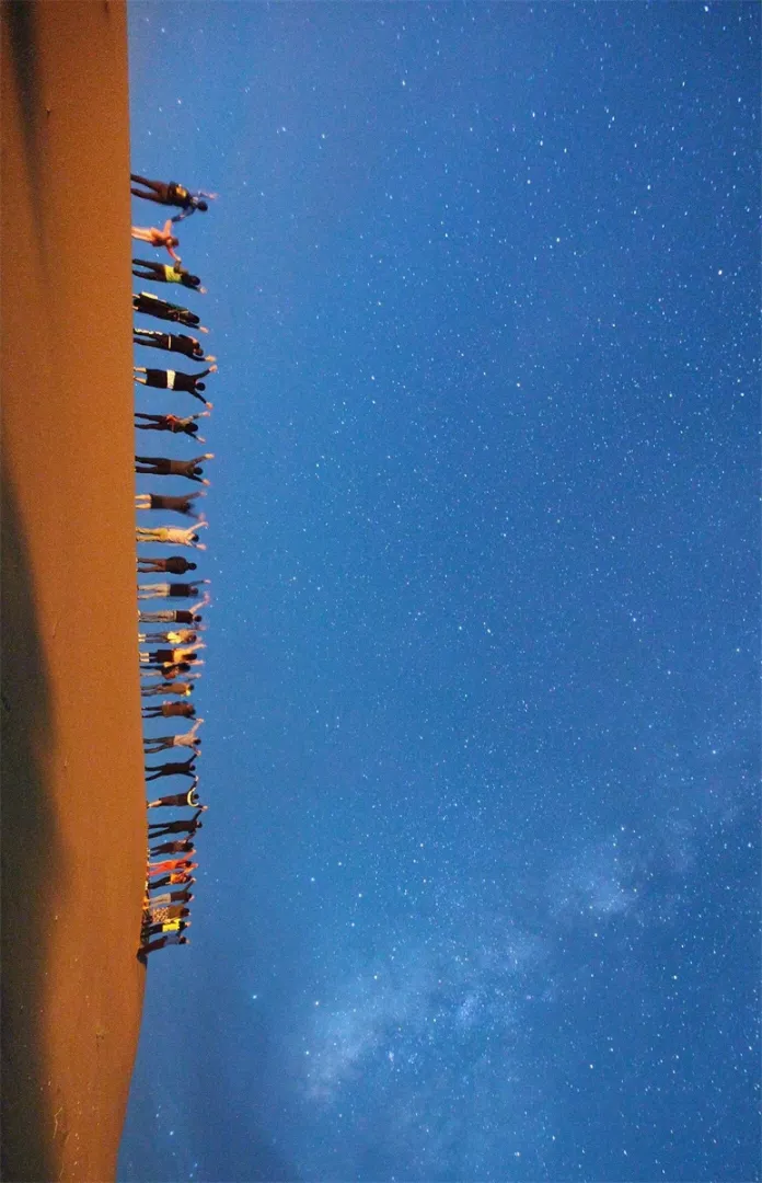 夜晚,新东方营员在腾格里沙漠,仰望星空,观赏银河倾泻、珍珠满天。极美的星夜,天上没有一朵浮云,深蓝色的天上,满缀着钻石般的繁星,引起孩子们的无限遐想,激发了孩子们对宇宙的探索欲望。