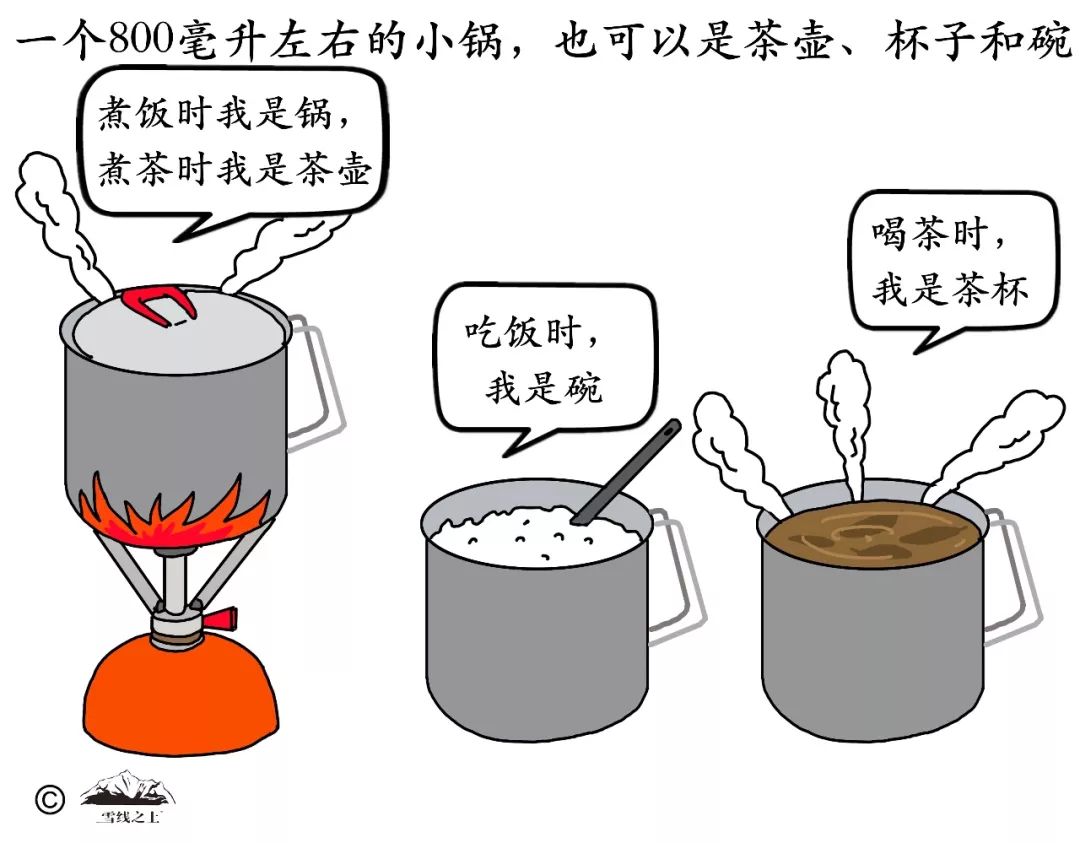 杯子、碗、锅、茶壶各自带一个,重量至少会在500克以上,不如“四合一”,比如一个850毫升的小锅,就既可以做茶壶,又可以做碗、杯。