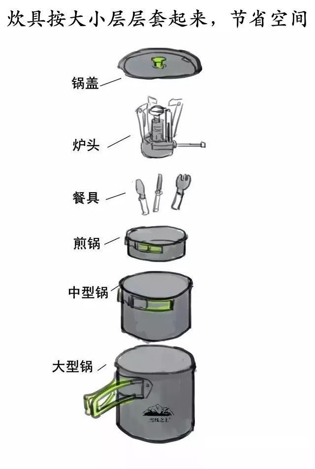 所以,你在购买时要注意它们的尺寸,让大锅、小锅、煎锅、餐具等可以套在一起。