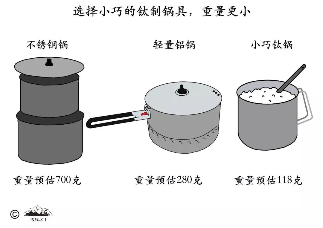 同样容积时,钛炊具比铝和不锈钢炊具更轻,如果愿意多花钱,就可以选择钛锅、钛碗、钛勺等,在不牺牲使用感受的情况下降低重量。