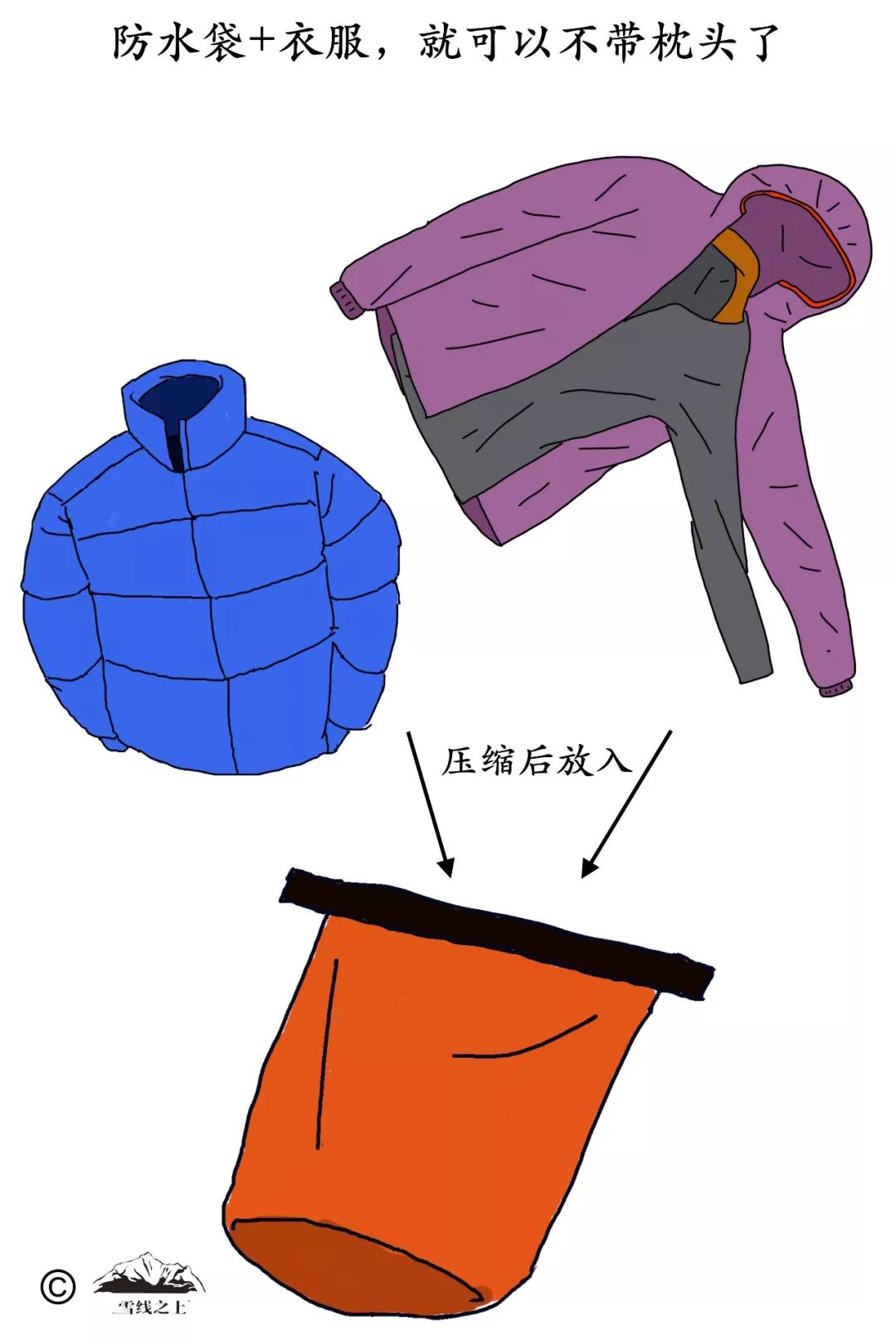 有枕头营地睡得香,但小枕头很容易滑跑,大枕头又很重,不妨把羽绒服、抓绒衣等柔软的衣服塞进防水袋并封好,你就不用带枕头了。