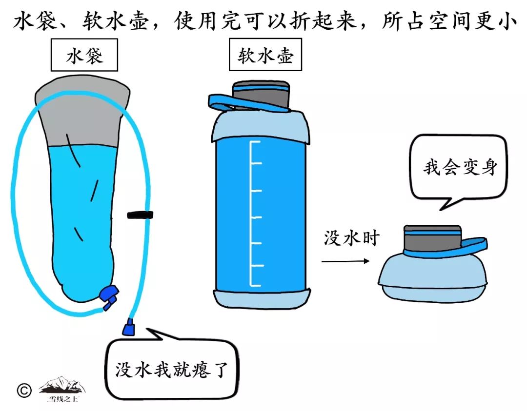 无论装水与否,硬水壶占用的空间都不增不减,而水袋、软水壶可折叠,并且随水量多少改变形态,省下不少空间。