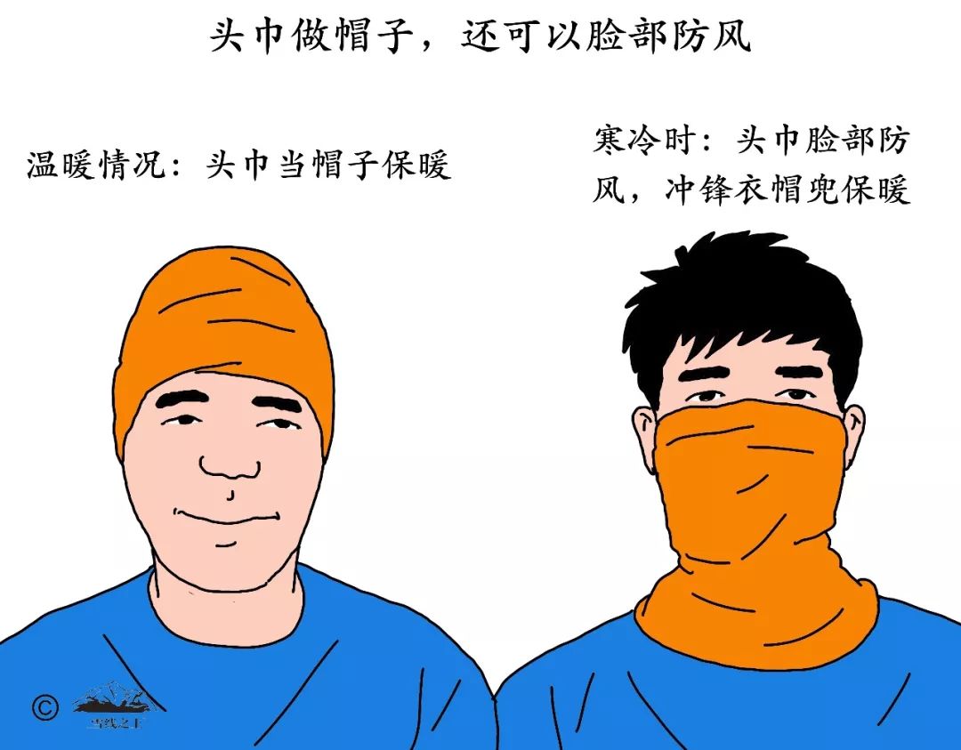 春秋登山,带上一条头巾,不太冷时戴在头上可以做帽子,有风时罩在脸上可以防风,同时配合冲锋衣兜帽来保暖。