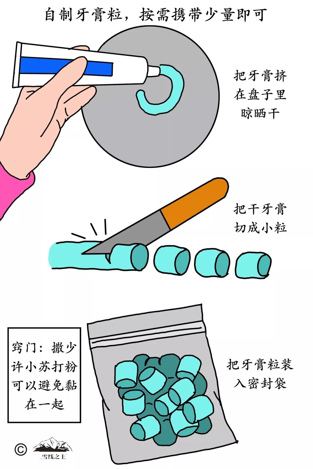 另外,在密封袋里撒一点小苏打粉,可以避免它们黏在一起。当然,你还可以直接购买固体牙膏粒带上山。