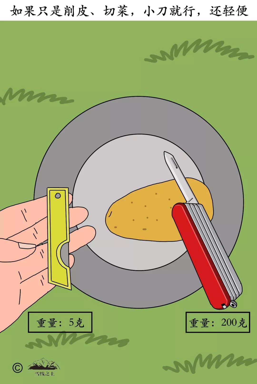 很多山友为了未雨绸缪,会携带集多种工具于一身的瑞士军刀,但对于很多路线,这种刀的大部分功能都用不上。如果只是削皮、切割小绳子,一把轻便的小刀就可以满足需求。
