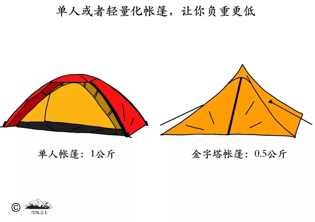 帐篷很占重量,但你也可以有更轻量的选择:比如选择单人帐篷,或者没有杖杆的金字塔帐篷。
