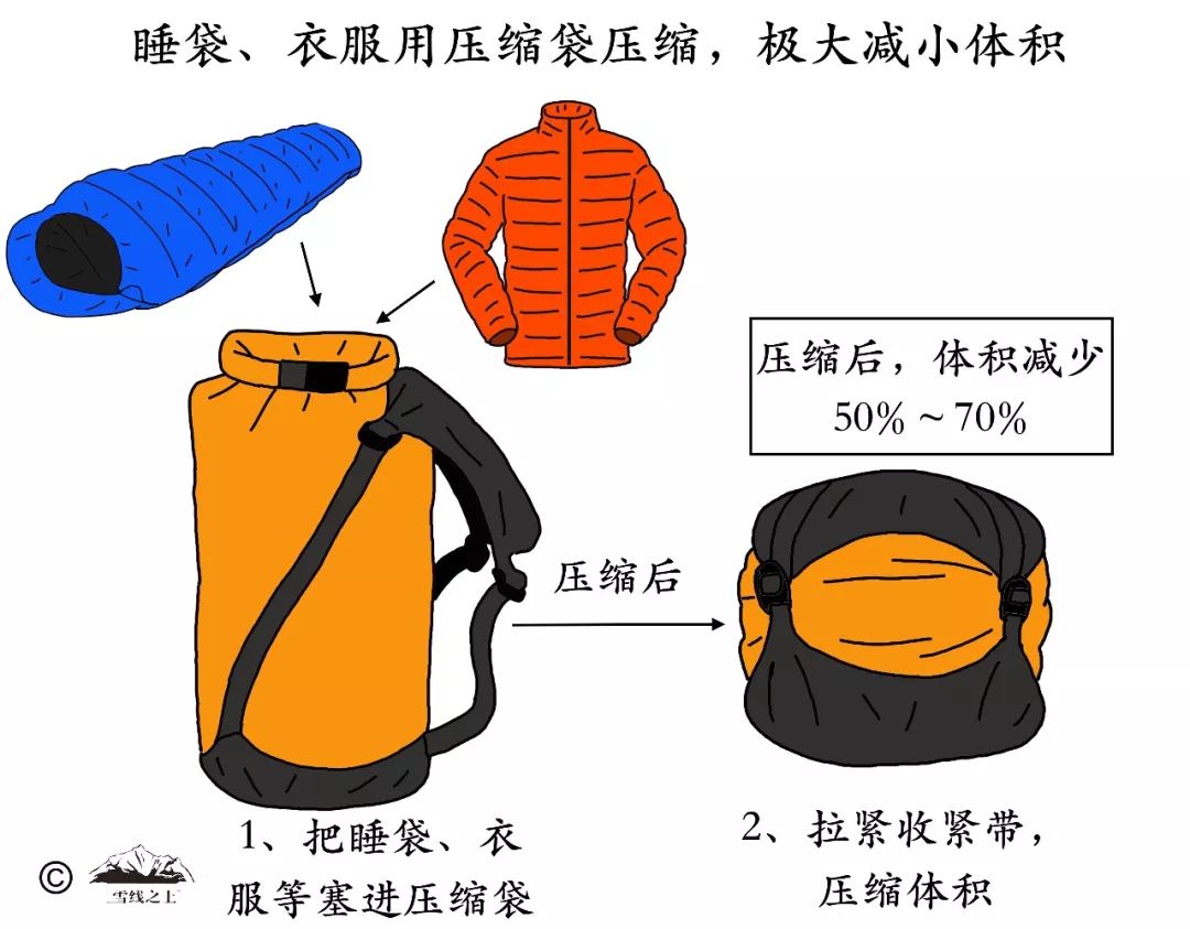 蓬松的睡袋、羽绒服、抓绒衣会占据你背包一半的空间,打包时,把它们都装入压缩袋,可以压缩50%以上的体积。