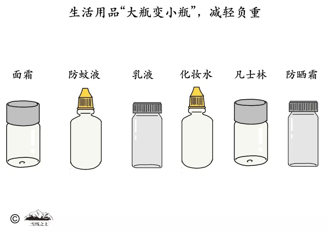 如果我们携带大瓶护肤品、大管牙膏等进山,但一次登山所用有限,就会浪费很多体力。要想降低背负,就要花点心思“化大为小”。