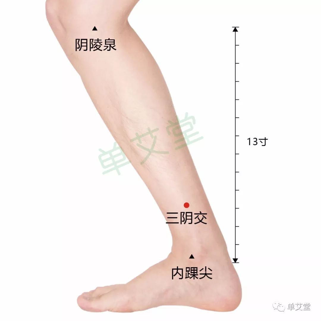 三阴交位置:三阴交位于小腿内侧,内踝尖直上3寸(4横指宽)、胫骨内侧缘后方,左右腿各有一穴。取穴时,在小腿内侧,从突起的骨踝向上量约4横指宽处的骨骼后侧边缘就是三阴交,按压时会稍微感觉疼痛。