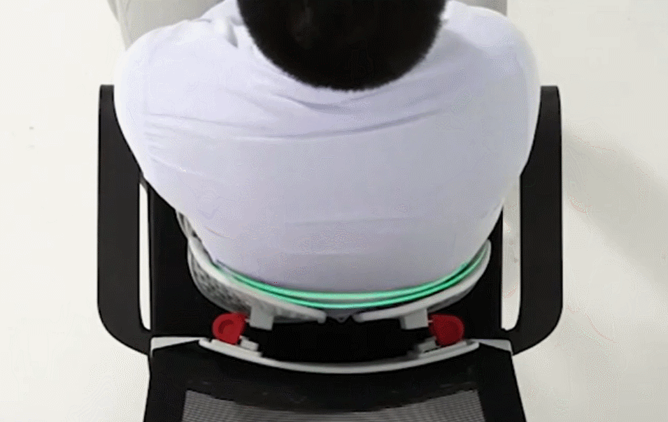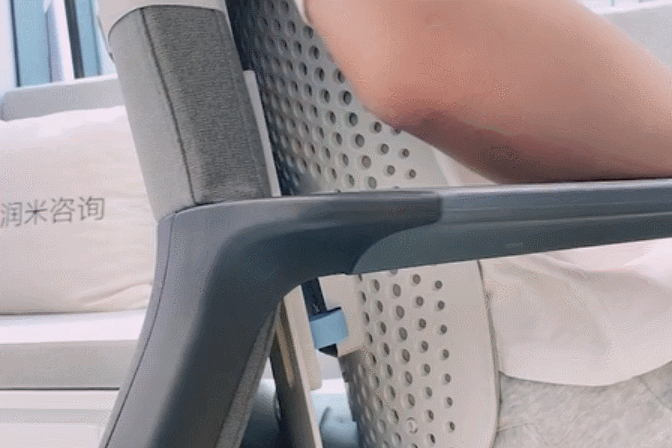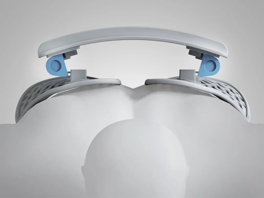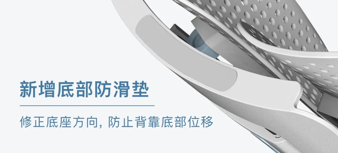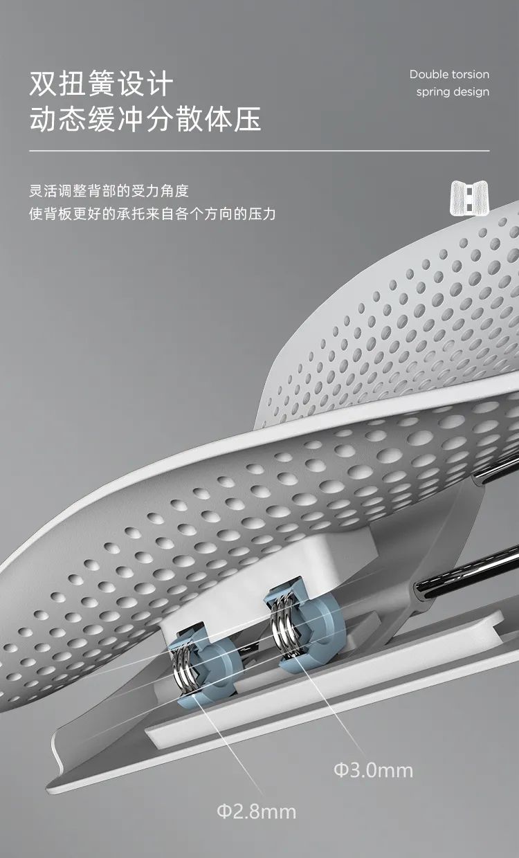 这款背靠依据人体工程学,设计了一种非常灵活的动态自适应调节结构——双扭簧。相较于普通压缩弹簧只有单一受力方向,双扭簧结构能够更稳定地承托来自各个方向的重量。