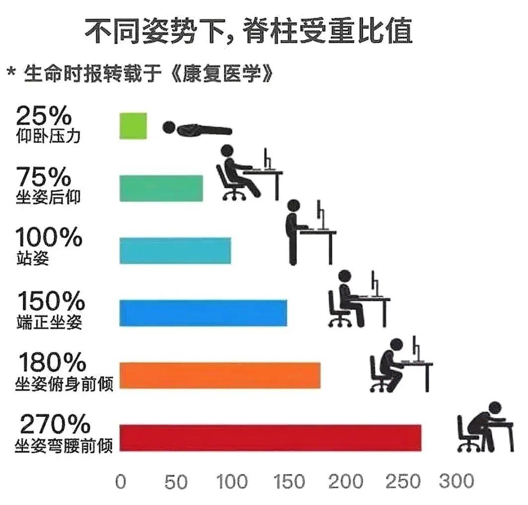 但是你知道吗?不良坐姿给脊椎造成的压力大得吓人!即使坐得端端正正,脊柱压力也不小;如果你喜欢驼背、前倾,压力就更大了。