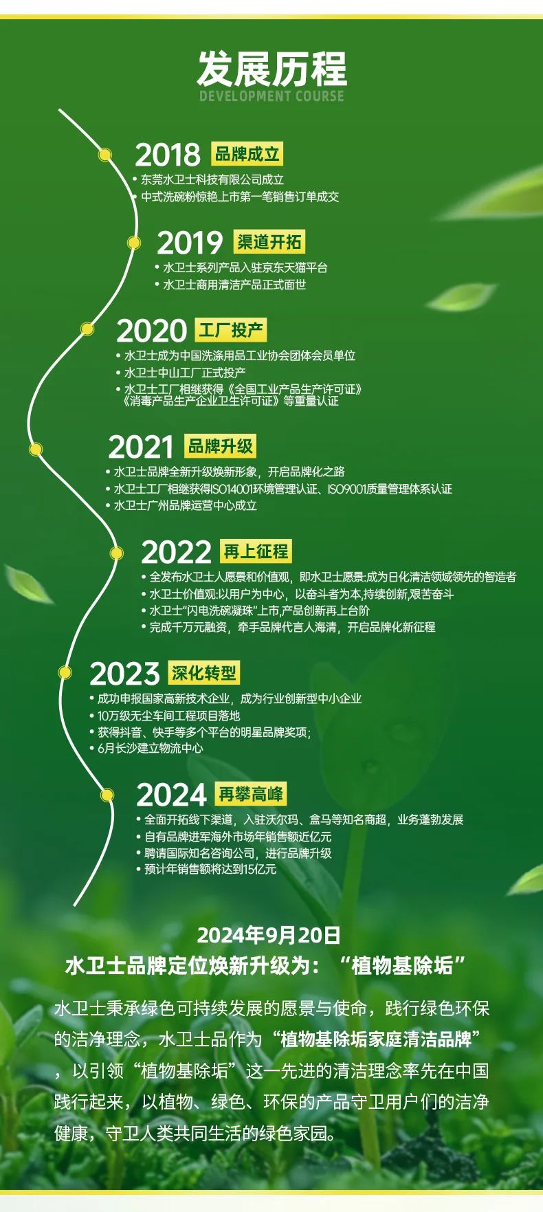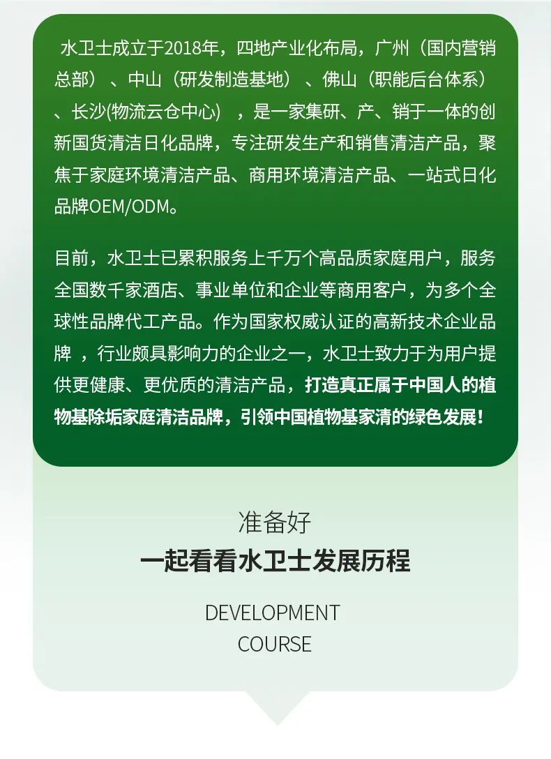 水卫士品牌成立于2018年,2024年9月20日原品牌名“水卫仕”升级为“水卫士”,品牌定位全方位焕新升级为“植物基除垢家庭清洁品牌”。