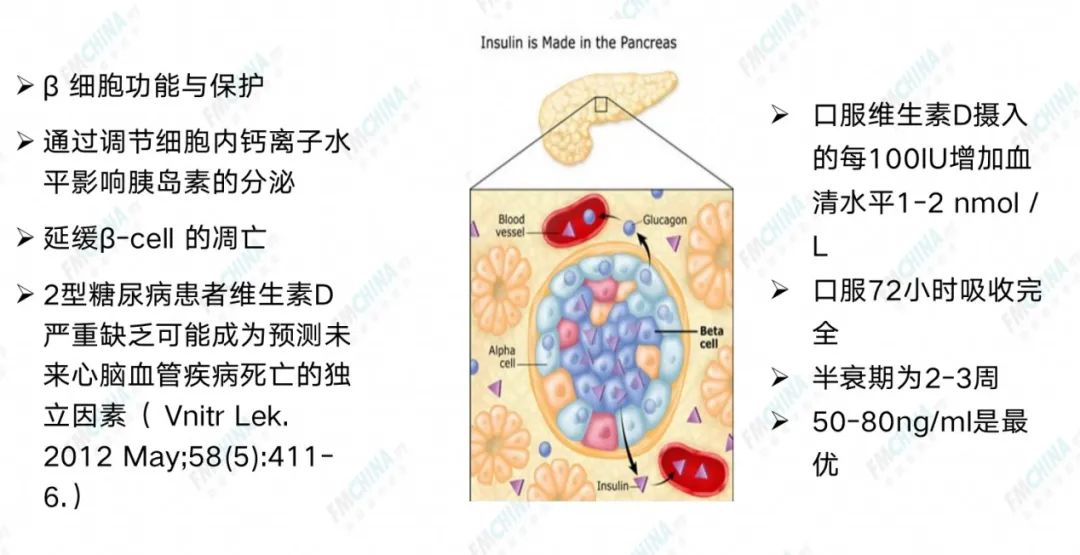 通常用在骨代谢疾病中的钙磷调节,特别是治疗骨质疏松。近年研究发现维生素D对胰岛B细胞功能有保护作用、可影响胰岛素的分泌、延缓B细胞的凋亡,当是II型糖尿病患者伴维生素D严重缺乏时,可成为预测心脑血管疾病死亡的独立因素。一些研究还发现维生素D对免疫疾病和肿瘤等疾病也有重要的作用。(见图三)故需检查II型糖尿病患者体内维生素D含量,并要把维生素D调到50-80ng/ml最优状态。