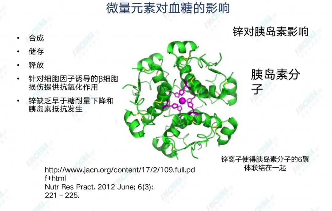 作为胰岛素的分子结构,分子中游离锌离子把胰岛素的六聚体连接在一起,当锌离子缺乏时,胰岛素的功能就会受到影响。锌离子还参与胰岛素合成、存储和释放,特别是针对细胞因子诱导的B细胞损伤时,它能提供抗氧化作用。因此锌离子缺乏就可以引起糖耐量减低和胰岛素抵抗发生。(见图一)可见微量营养不足,是可以影响胰岛素的功能,是引起糖尿病的病因之一。