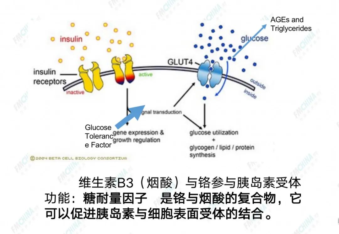 它是铬和烟酸(B3)的复合物。糖耐量因子可以促进胰岛素与细胞表面的受体结合。胰岛素与受体结合后就会引起细胞内一系列级联反应发生,促使细胞内糖原、脂质和蛋白合成,葡萄糖利用,葡萄糖转运体到细胞膜上把细胞外的葡萄糖转移的细胞内。如果铬或烟酸不足时,细胞膜上的受体功能受到影响,细胞外的胰岛素不能进入细胞内,葡萄糖也不能从细胞外进入细胞内代谢产能。铬和烟酸影响细胞膜上的受体功能(见图二),这是引起II型糖尿病的病因之一。在临床上可以看见部分II型糖尿病患者伴有高胰岛素血症。