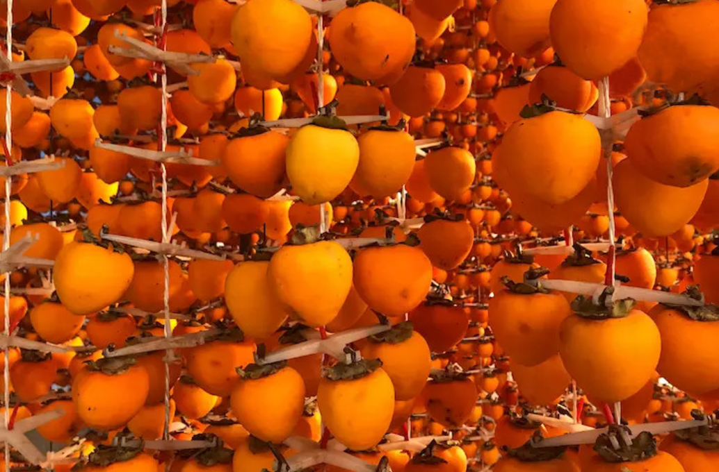 隆冬养韬光,柿子析白霜。霜降过后的寒冷天气,成了柿饼最佳的调味品。采摘下熟得刚刚好的柿饼,削皮,悬挂,等日晒、等风吹,等时间带来的变化。