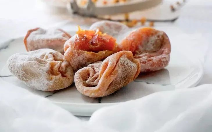 ◎柿霜 滋阴润燥、化痰止咳的天然糖结晶柿霜,是曝晒柿子时果肉中的水分蒸发而渗出的糖分,有滋阴、润燥、生津等药效。