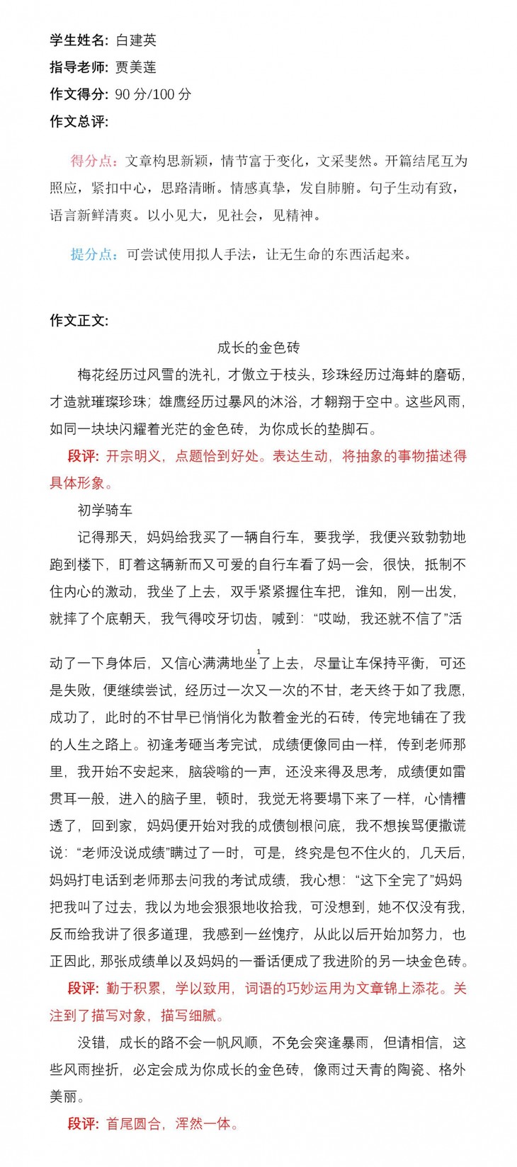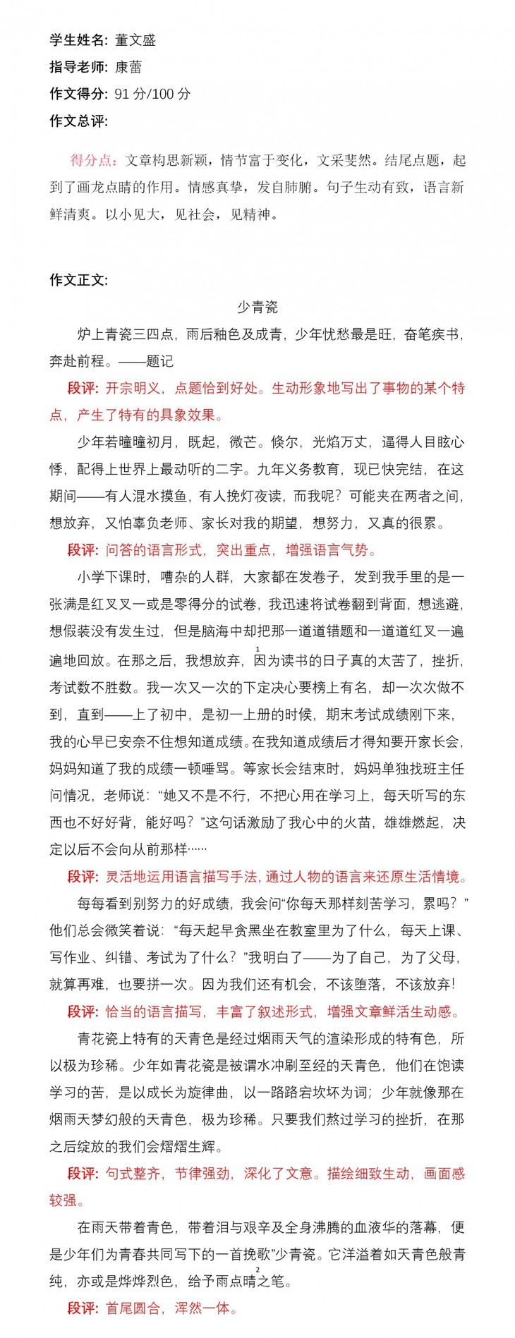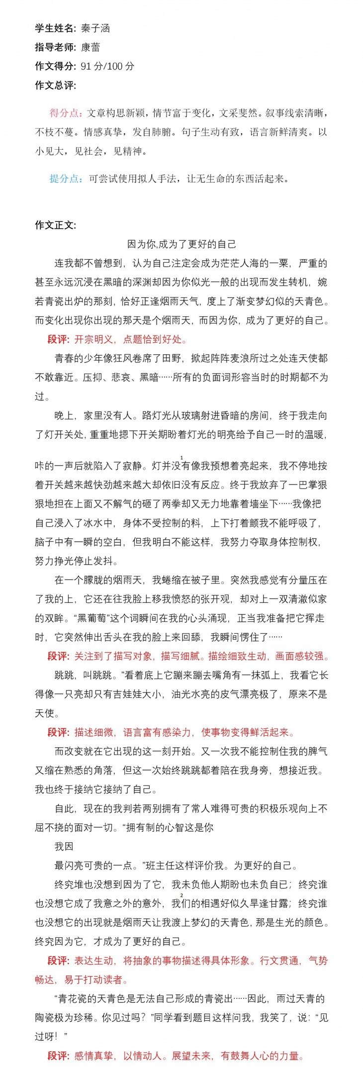 你是一个坚毅而聪颖的孩子,想象力丰富。老师希望你能乘着这次创新作文的东风,乘风破浪,在写作之路上收获满满!加油!老师一路支持你!