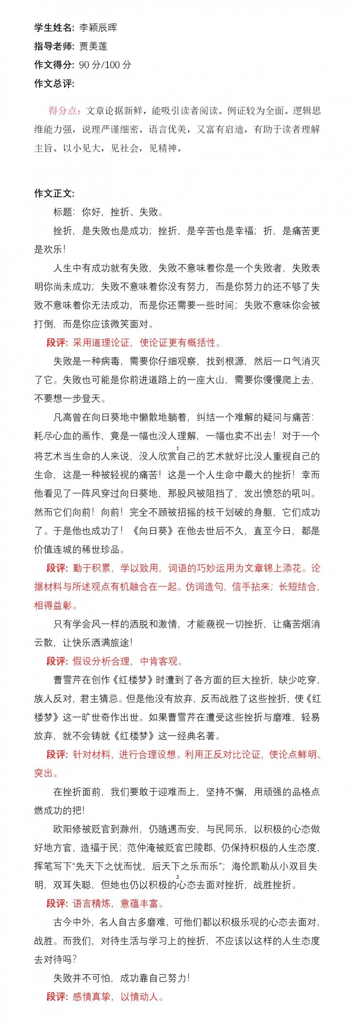 关于我选的这个主题,我想到古今中外一些文人的经历,于是选用了“你好,挫折,失败”这一题目。关于挫折、失败,脑海中浮现出梵高的《向日葵》、曹雪芹的《红楼梦》,以及一些被贬官却依然随遇而安、与民同乐、豁达乐观的欧阳修和范仲淹…正如文中所说“失败并不可怕,成功靠自己努力”。希望像他们一样的你们可以竭尽全力,去迎接美好的明天!