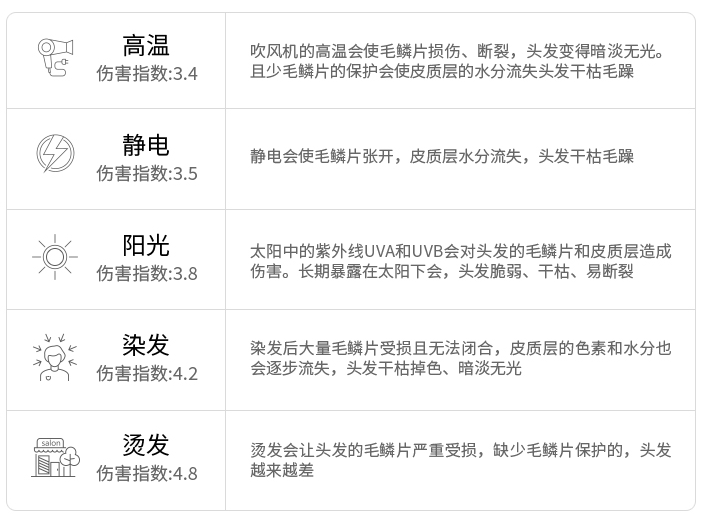 无论是因为什么样的原因导致的发质受损,都能改善修补,在缓解头发毛躁的同时,提高头发亮度。
