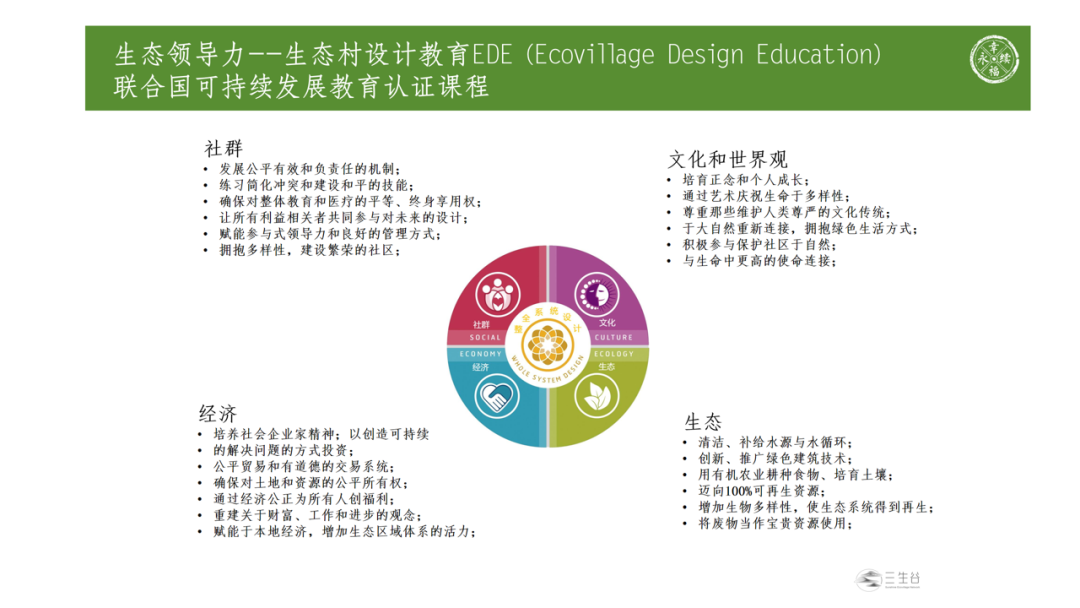生态村设计教育EDE是全球生态村联盟根据各国成千上万生态村优秀案例中提炼和发展出来的一门创新教育课程,是联合国可持续发展教育认证的课程。经过三生谷学习和实践多年,目前已基本完成在地化与本土化,并形成了一套生态村设计与领导力培养的课程体系。