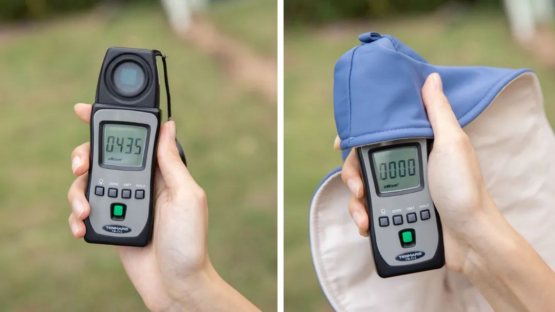 防晒效果也“能看到”,仔细看帽檐上的logo,颜色会随着紫外线的强度变化(越深色紫外线越强)