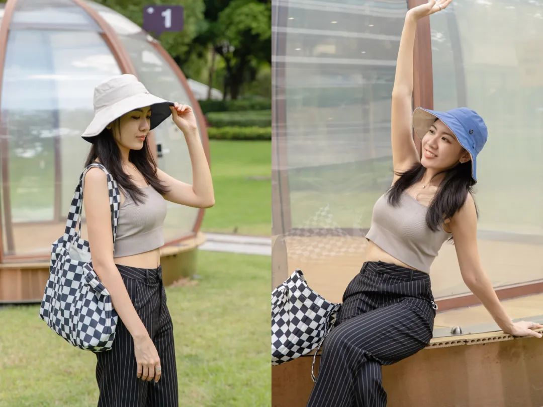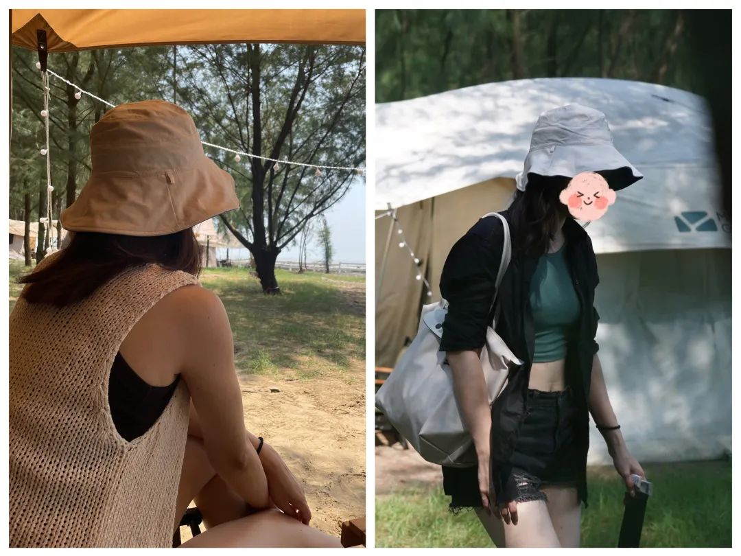 朋友Liz一直觉得自己头大,在身边人中出了名的不爱戴帽子。中秋假期去露营找我要装备,我就塞了防晒帽给她,刚开始还一脸嫌弃的,结果露营到一半就找我要链接了。说帽子竟然不丑,还跟她的穿搭很配~