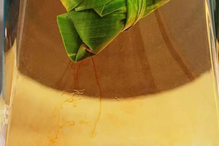 将粽茶放入杯中,箬叶清新与红茶馥郁短时便可溢出。