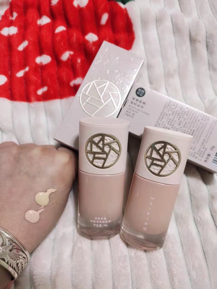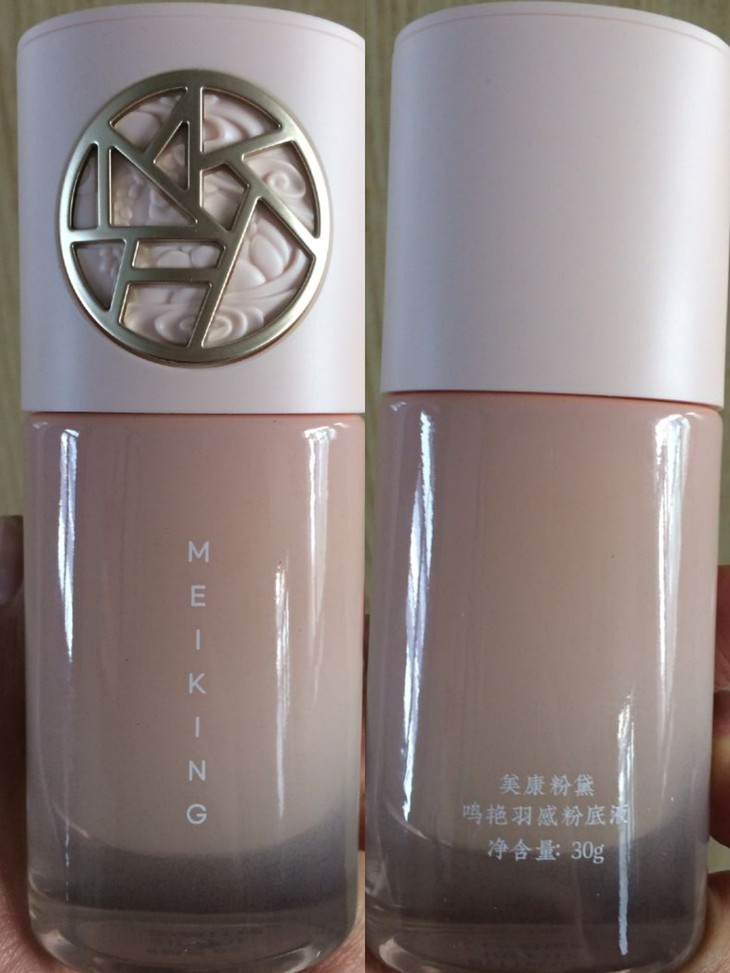 亲,收到了羽感粉底液!首先感谢!感谢美康粉黛!寄给我这么棒的产品!第一感觉,哇这个粉底液怎么这么高大尚,外观很大气时尚又粉粉的,太喜欢了,摸了摸瓶身像水晶一样,手感太好了,打开瓶盖,挤出一点粉底液,抹在手上,一抹即化,奶油质地,粉质细腻,一点也不卡粉,还透着光亮,上妆绝绝子啦,粉底液的味道好像是一种植物的味道淡淡的透着花香,太好闻了,我拍了在手上的用后效果,很明显前后有着截然不同的对比,明显手背的颜色有着很大的变化,变得粉嫩又白了,而且还可以遮住手上的斑斑点点,我选的是旖粉01,没错,这个色号我太喜欢啦,总之我是很爱这款粉底液!以后就用它了!