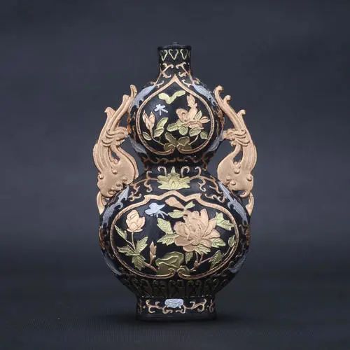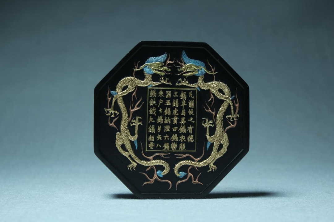 此作品的墨模具图案造型取材清代贡品徽墨,从制作方法和墨模雕刻手法都跟古代如出一辙,可以说原汁原味的保留了清代徽墨的精髓。此墨正面刻绘八宝吉祥云纹图,背面阴文御题填金文配双龙图,墨为八边形正好与作品寓意相同都是八宝吉祥的含意。