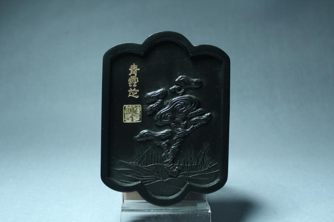 作品为文人墨,古雅朴素,墨锭正面刻绘灵芝一株,背面为山水苍松图,细细观赏其墨自成一界,不禁让人心生把玩之意。