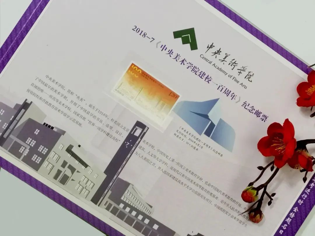 邮票采取胶雕套印工艺,使用金属荧光雕刻油墨,体现了中央美院“风雨砥砺薪火相传”的精神。