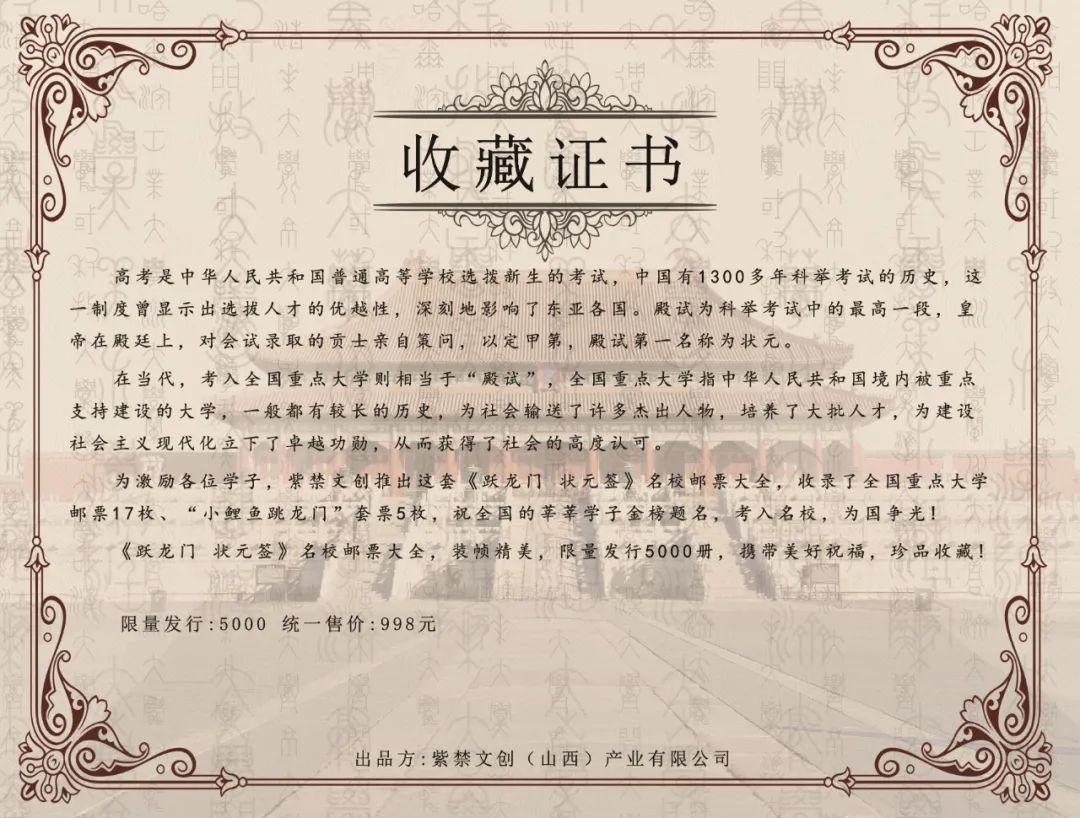 紫禁文创特出品《跃龙门·状元签》金榜题名名校邮票大全珍藏册,一次性收录了全国重点大学邮票22枚!