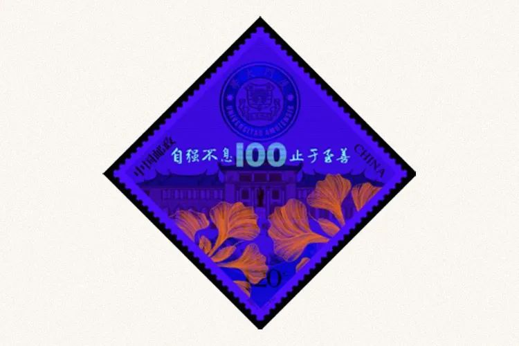 邮票采用中轴对称的构图形式,结合紫色与金色的互补色调,烘托了百年校庆的庄重与辉煌。