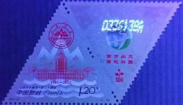 荧光灯下,用防伪红色荧光油墨印制的校徽、知新楼、“百廿山大 强校兴国”、“SDU”字样及树芽,呈现红色的光芒;作为背景的山大LOGO图案,校庆标志也显出荧光的效果。整个邮票综合体现出山东大学深厚的历史底蕴和鲜明的文化特色。