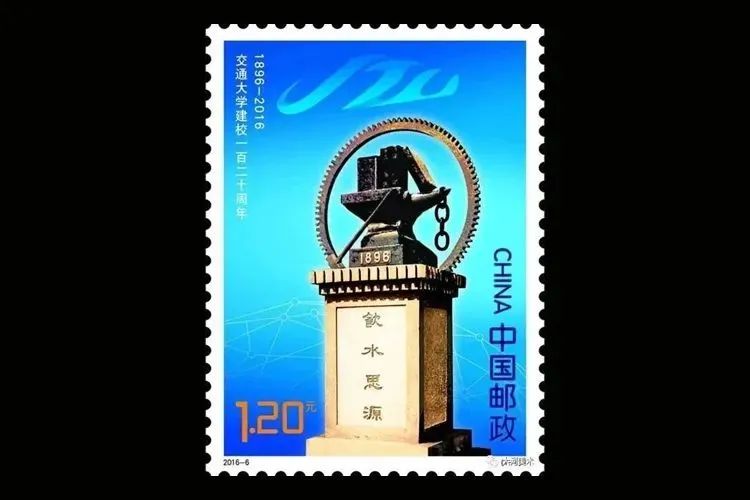 邮票以铸有交通大学校徽的“饮水思源”纪念碑为主图,背景的蓝色渐变彰显交大人海纳百川、放眼世界的胸怀和抱负。