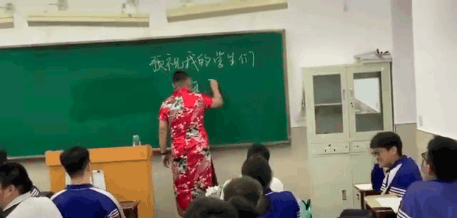甚至有男老师穿上红旗袍为孩子们争取个“旗开得胜”的好兆头▼