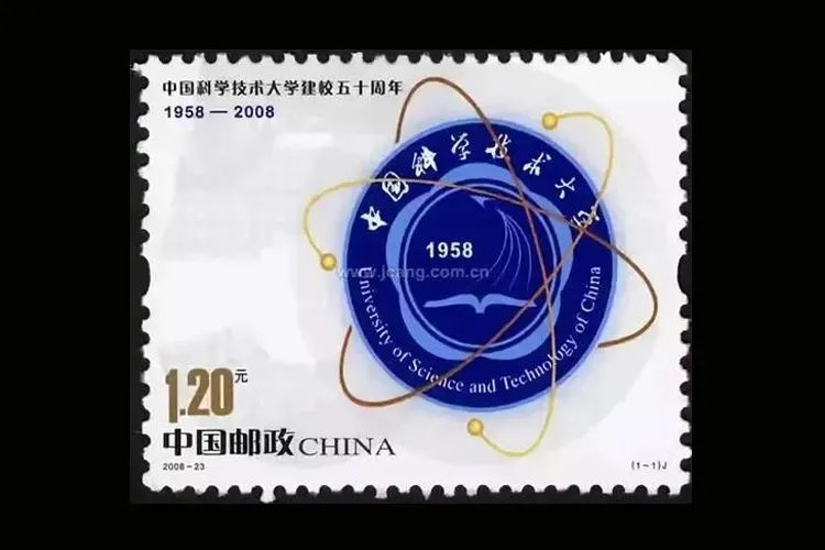 邮票以深蓝色的科大校徽为主图,形象地将校徽比作原子核,周围绕以金色的原子运动轨迹,进一步强调了科大的学校性质和建校50年来所走过的光辉。